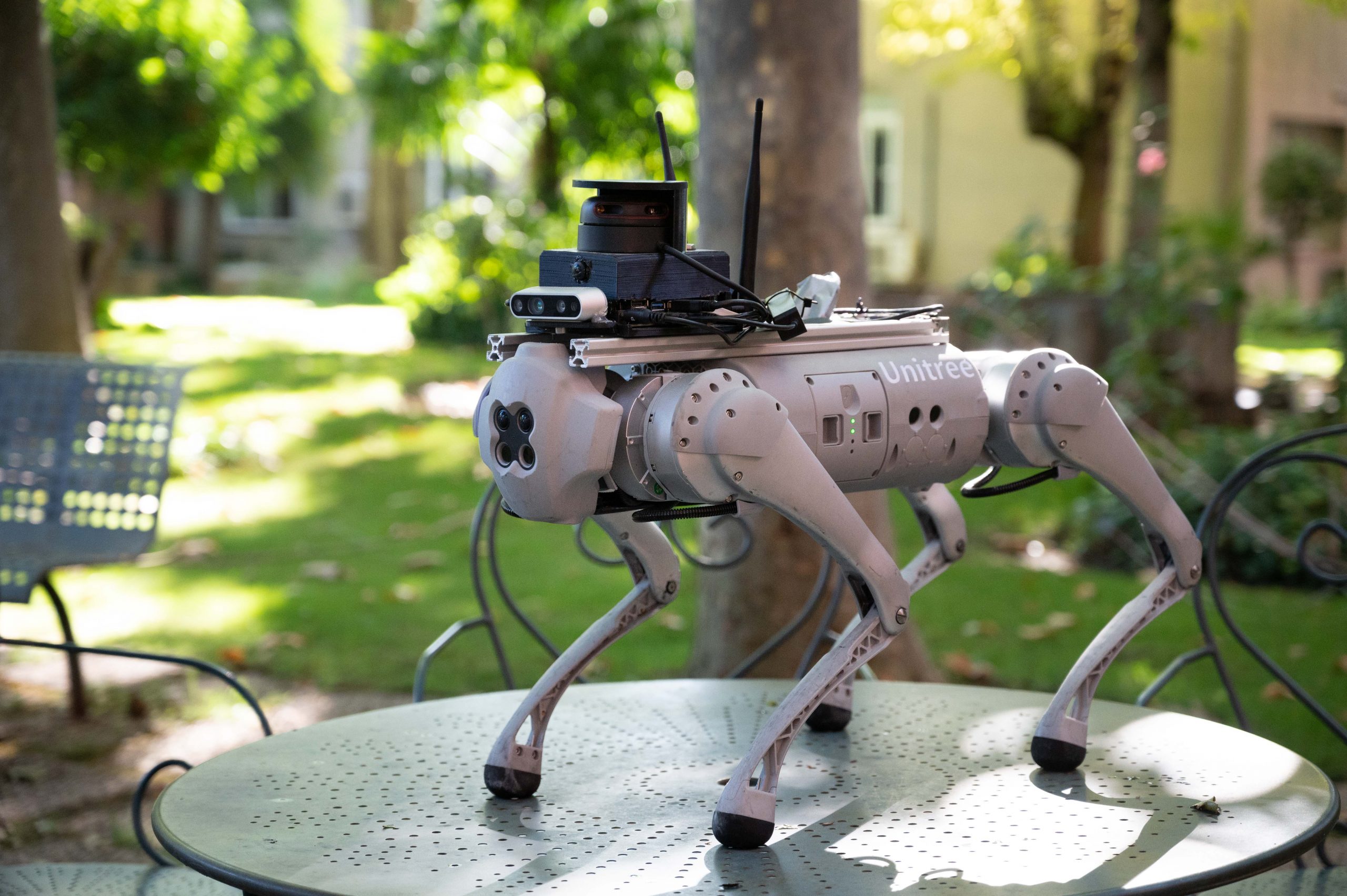 Su forma cuadrúpeda lo convierte en adecuado para moverse en cualquier entorno, incluso en escaleras, y es capaz de dar una voltereta hacia atrás. “Es muy robusto y dinámico en entornos accidentados y mucho más económico que un perro guía. Actualmente ya se ha desarrollado la conducción automática para el guiado, así como la inteligencia artificial necesaria para la detección de objetos, personas y señalización. Puede comunicarse por voz con la persona para realizar las tareas que se soliciten y puede además contar lo que ve a través de su cámara y la información que recibe de internet”, indica Portilla.