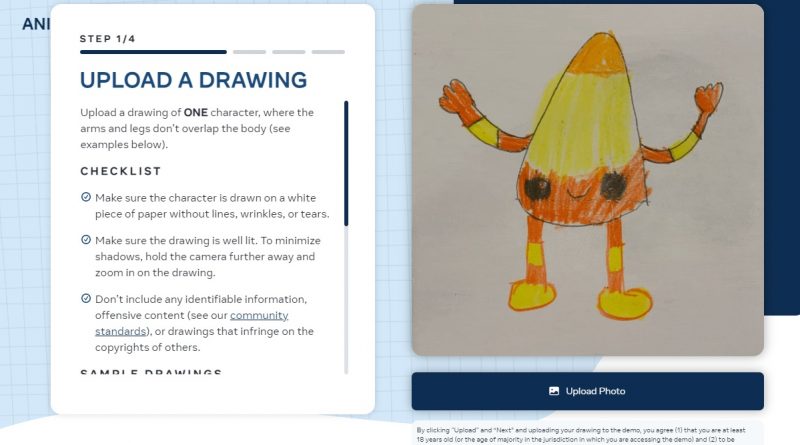 El primer paso es cargar un dibujo, o usar uno de los modelos disponibles. El sitio explica que el dibujo debe tener un solo personaje, con todas sus extremidades separadas del cuerpo. También recomienda que la imagen sea clara o posea muy buena iluminación, y que no incluya ningún tipo de identificación.