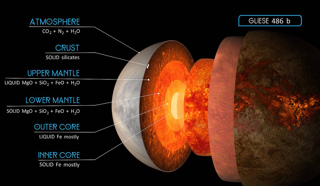 Gracias a los datos cuidadosamente obtenidos con un conjunto de instrumentos y telescopios espaciales, un equipo de astrónomos liderado por José A. Caballero, del Centro de Astrobiología (CAB), CSIC-INTA, han podido modelar el interior y estimar los tamaños relativos del núcleo (metálico) y el manto (rocoso) del exoplaneta Gliese 486 b, descubierto en 2021.