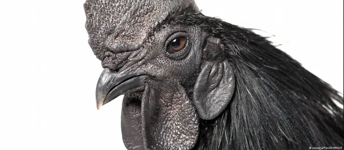 El ayam cemani, una apreciada raza de pollos indonesios, es el resultado de una mutación genética que produce un ave completamente negra, desde el pico hasta los huesos.