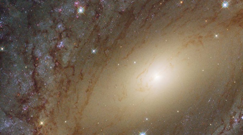NGC 6744 es similar a nuestra galaxia en más de un sentido. Al igual que la Vía Láctea, NGC 6744 tiene una región central prominente llena de viejas estrellas amarillas. Alejándose del núcleo galáctico, uno puede ver partes de los polvorientos brazos espirales pintados en tonos de rosa y azul; mientras que los sitios azules están llenos de cúmulos estelares jóvenes, los rosados son regiones de formación estelar activa, lo que indica que la galaxia todavía está muy animada.