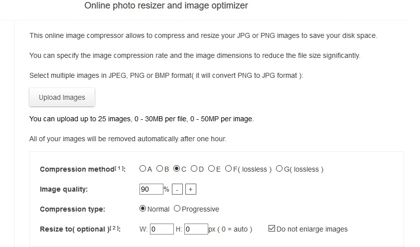 Para ello vamos a hacer uso de la herramienta llamada Online Photo Resizer que además nos va a permitir llevar a cabo estas tareas por lotes, es decir, tratando con varias imágenes de manera simultánea y de una sola vez. Por tanto, para empezar lo primero que haremos será subir las fotos que deseamos tratar a la aplicación desde el botón “Upload Images”, teniendo un límite de 25 fotos simultáneas o 30 megas para cada una de ellas.